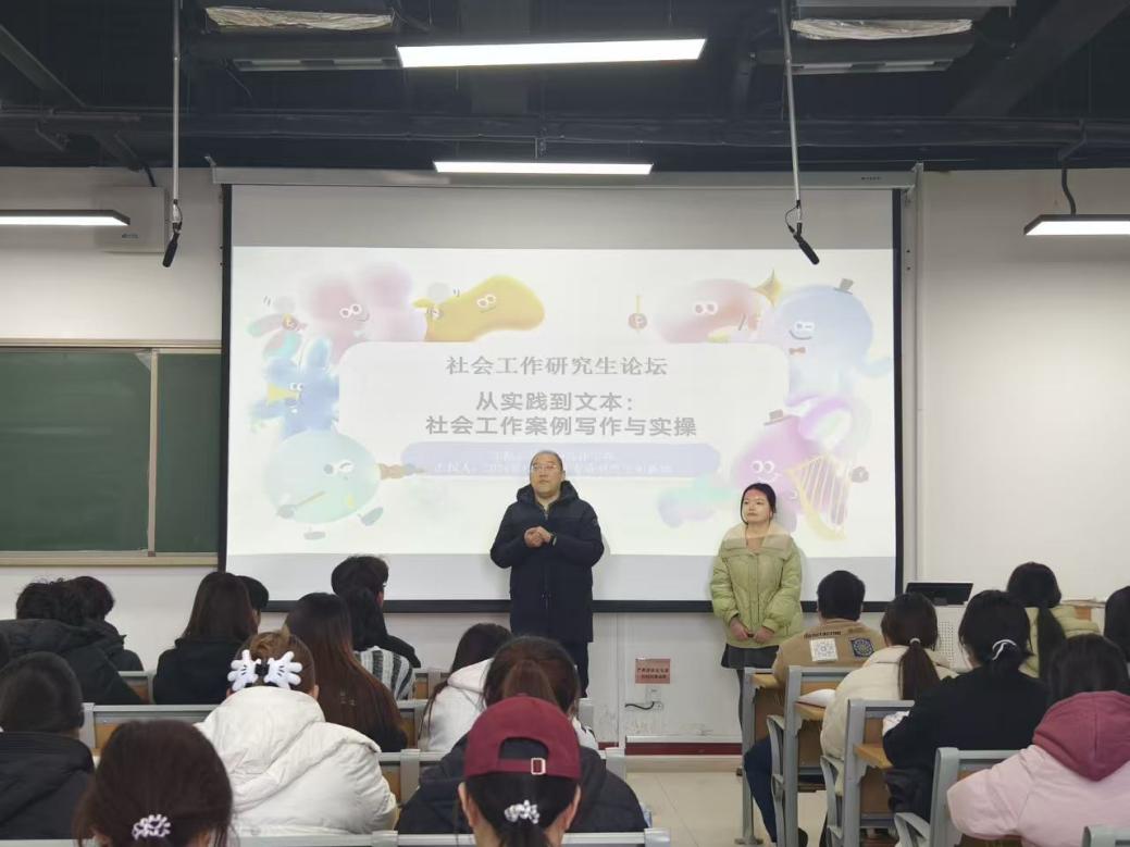 2025年12月4日,政治与法律学院在九原校区202教室举办“从实践到文本:社会工作案例写作与实操”研究生论坛。本次论坛由2024级社会工作专业研究生胡新婧主讲,导师魏成副教授主持。胡新婧同学围绕案例写作与项目实操展开系统讲解,助力学生提升专业表达与竞赛能力。
