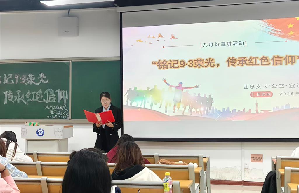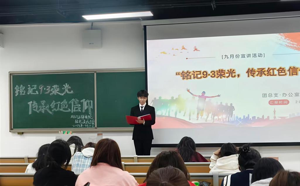为帮助学生深入了解9•3抗日战争胜利纪念日的历史背景与重大意义,增强对革命历史的认知,树立正确的历史观,政治与法律学院于2025年9月24日19:00在教学楼208教室成功举办“铭记9•3荣光,传承红色信仰”主题宣讲活动。此次宣讲活动旨在引导广大学生铭记历史、缅怀先烈,从抗战胜利的伟大征程中汲取奋进力量,让红色信仰在校园中扎根生长。