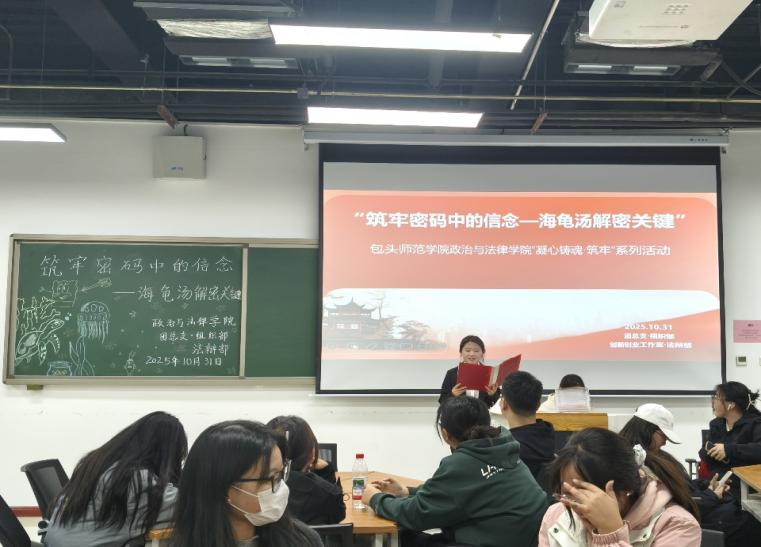 为丰富校园文化生活,锻炼学生的逻辑思维能力,凝聚学生们的信念力量。政治与法律学院团总支组织部和创新创业工作室法辩部于2025年10月31日在九原校区综合教学楼206教室举办“筑牢密码中的信念—海龟汤解密关键”活动,政治与法律学院部分学生参加。