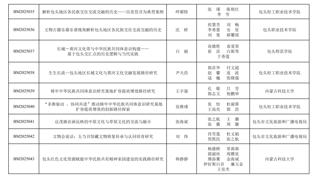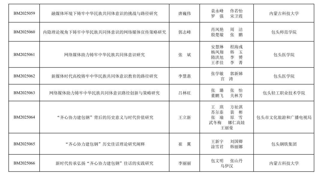 2026年1月26日,中共包头市委统战部、包头市民族事务委员会公布2025年度包头市铸牢中华民族共同体意识研究课题立项名单。我院郭志峰老师主持的《内隐理论视角下铸牢中华民族共同体意识的网络媒体宣传策略研究》、白丽老师主持的《长城-黄河文化大带与中华民族共同体意识构建——基于包头交汇点的历史逻辑与当代实践》、双双获批立项。